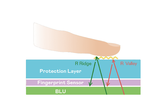 TFT 指纹扫描感测技术利用薄膜电晶体 (TFT) 当作光感测元件,,藉由非晶硅 (a-Si) 与低温多晶硅(LTPS)既有光电转换特性对不同波段光源进行吸收,,,,使感测 IC 读取阵列感测元件的光漏电差异,,转换成数位灰阶影像。。